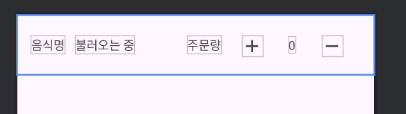 <?xml version="1.0" encoding="utf-8"?> <androidx.constraintlayout.widget.ConstraintLayout xmlns:android="http://schemas.android.com/apk/res/android" xmlns:app="http://schemas.android.com/apk/res-auto" xmlns:tools="http://schemas.android.com/tools" android:layout_width="match_parent" android:layout_height="wrap_content" android:padding="12dp" android:transitionGroup="true"> <TextView android:id="@+id/foodNameTitle" android:layout_width="wrap_content" android:layout_height="wrap_content" android:layout_marginTop="12dp" android:layout_marginBottom="12dp" android:text="음식명" app:layout_constraintBottom_toBottomOf="parent" app:layout_constraintEnd_toEndOf="parent" app:layout_constraintHorizontal_bias="0.011" app:layout_constraintStart_toStartOf="parent" app:layout_constraintTop_toTopOf="parent" app:layout_constraintVertical_bias="0.0" /> <TextView android:id="@+id/foodNameTextView" android:layout_width="wrap_content" android:layout_height="wrap_content" android:layout_marginStart="12dp" android:text="불러오는 중" app:layout_constraintBottom_toBottomOf="@+id/foodNameTitle" app:layout_constraintStart_toEndOf="@+id/foodNameTitle" app:layout_constraintTop_toTopOf="@+id/foodNameTitle" /> <TextView android:id="@+id/foodOrderCountTitleTextView" android:layout_width="wrap_content" android:layout_height="wrap_content" android:layout_marginStart="184dp" android:text="주문량" app:layout_constraintBottom_toBottomOf="@+id/foodNameTextView" app:layout_constraintStart_toStartOf="parent" app:layout_constraintTop_toTopOf="@+id/foodNameTextView" app:layout_constraintVertical_bias="1.0" /> <TextView android:id="@+id/orderCountTextview" android:layout_width="wrap_content" android:layout_height="wrap_content" android:layout_marginStart="8dp" android:layout_marginEnd="8dp" android:text="0" app:layout_constraintBottom_toBottomOf="@+id/foodOrderCountTitleTextView" app:layout_constraintEnd_toStartOf="@+id/orderCountMinusButton" app:layout_constraintStart_toEndOf="@+id/orderCountPlusButton" app:layout_constraintTop_toTopOf="@+id/foodOrderCountTitleTextView" /> <ImageView android:id="@+id/orderCountPlusButton" android:layout_width="wrap_content" android:layout_height="wrap_content" android:layout_marginStart="24dp" app:layout_constraintBottom_toBottomOf="@+id/foodOrderCountTitleTextView" app:layout_constraintStart_toEndOf="@+id/foodOrderCountTitleTextView" app:layout_constraintTop_toTopOf="@+id/foodOrderCountTitleTextView" app:layout_constraintVertical_bias="0.0" app:srcCompat="@drawable/add_24px" /> <ImageView android:id="@+id/orderCountMinusButton" android:layout_width="24dp" android:layout_height="wrap_content" android:layout_marginEnd="24dp" app:layout_constraintBottom_toBottomOf="@+id/orderCountPlusButton" app:layout_constraintEnd_toEndOf="parent" app:layout_constraintTop_toTopOf="@+id/orderCountPlusButton" app:layout_constraintVertical_bias="0.0" app:srcCompat="@drawable/remove_24px" /> </androidx.constraintlayout.widget.ConstraintLayout>이제 레이아웃 설정은 끝났습니다.